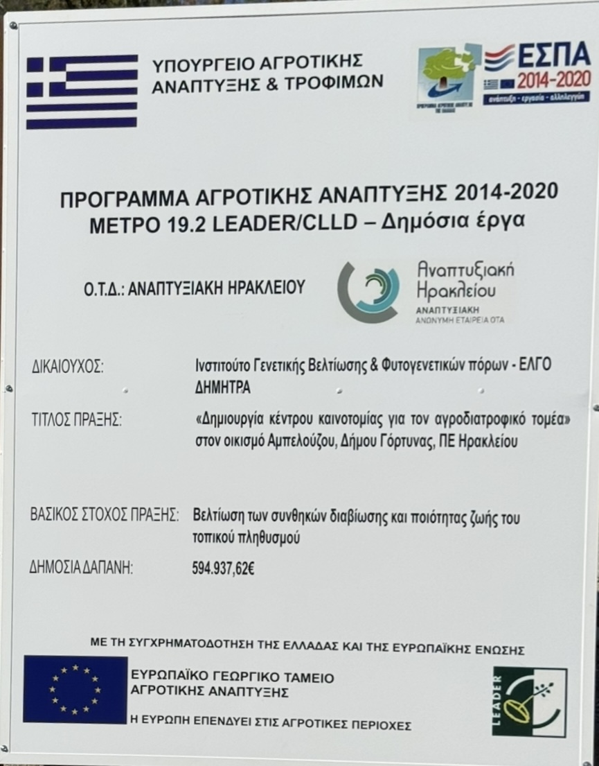 Τα έργα στη Γεωργική Σχολή πρέπει να παραδοθούν μέχρι τα τέλη του επόμενου μήνα σύμφωνα με τον πρόεδρο της αναπτυξιακής Γιώργο Μαυρογιαννη και προβλέπουν, με συνολικό προϋπολογισμό 1.178.957,52€, την δημιουργία του «Κέντρου Επιμόρφωσης και Ενημέρωσης Αγροτών της Γεωργικής Σχολής Μεσαράς», στον Αμπελούζο του δήμου Γόρτυνας και την δημιουργία «Κέντρου Καινοτομία για τον αγροδιατροφικό τομέα».