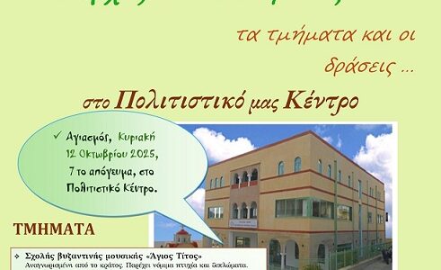 Ο Αγιασμός για την έναρξη λειτουργίας των τμημάτων, θα γίνει την Κυριακή  12 Οκτωβρίου 2025 και ώρα 7 μ. μ., θα ακολουθήσει μουσική εκδήλωση με βυζαντινούς ύμνους και  παραδοσιακά τραγούδια  από τη χορωδία της Σχολής  Βυζαντινής Μουσικής και την  Παραδοσιακή χορωδία και ορχήστρα του Πολιτιστικού μας Κέντρου, στο αμφιθέατρό του, στις Μοίρες.