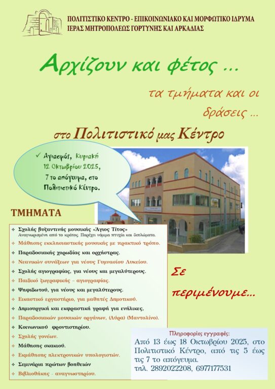 Αρχίζουν οι δραστηριότητες του Πολιτιστικού Κέντρου της Ιεράς Μητροπόλεως Γορτύνης και Αρκαδίας.
