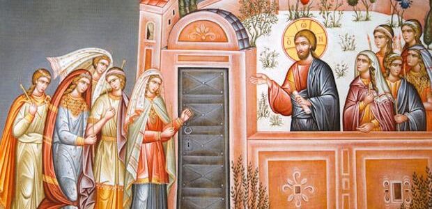 Η Βασιλεία των Ουρανών, μας λέει ο Ιησούς, μοιάζει με την παραβολή των 10 Παρθένων. Η ιστορία τους εν τάχει: Πέντε φρόνιμες και πέντε μωρές παρθένοι περιμένουν το Νυμφίο (γαμπρό) να έλθει να παραλάβει τη νύφη. Οι φρόνιμες παίρνουν μαζί με τα αναμμένα λυχνάρια τους και λάδι, όχι όμως και οι μωρές. Ο νυμφίος, όμως, αργεί, οι παρθένες νυστάζουν και κοιμούνται. Όταν ακούγεται η φωνή «Ιδού ο Νυμφίος έρχεται», οι μωρές παρθένες ψάχνουν να βρουν λάδι για να ανάψουν τα σβησμένα λυχνάρια τους, αργοπορούν και μένουν έξω από το γάμο, δηλαδή «εκτός νυμφώνος».