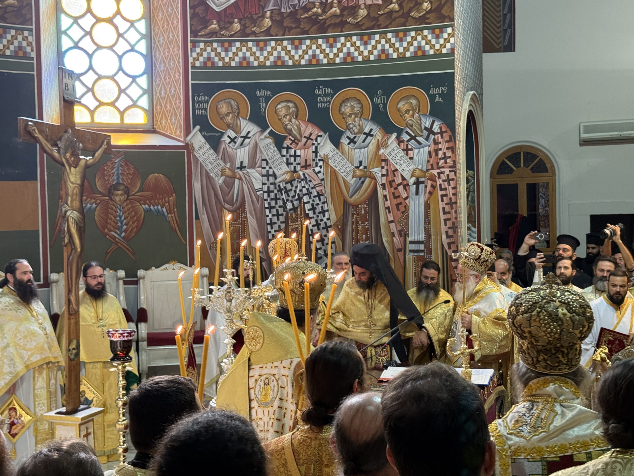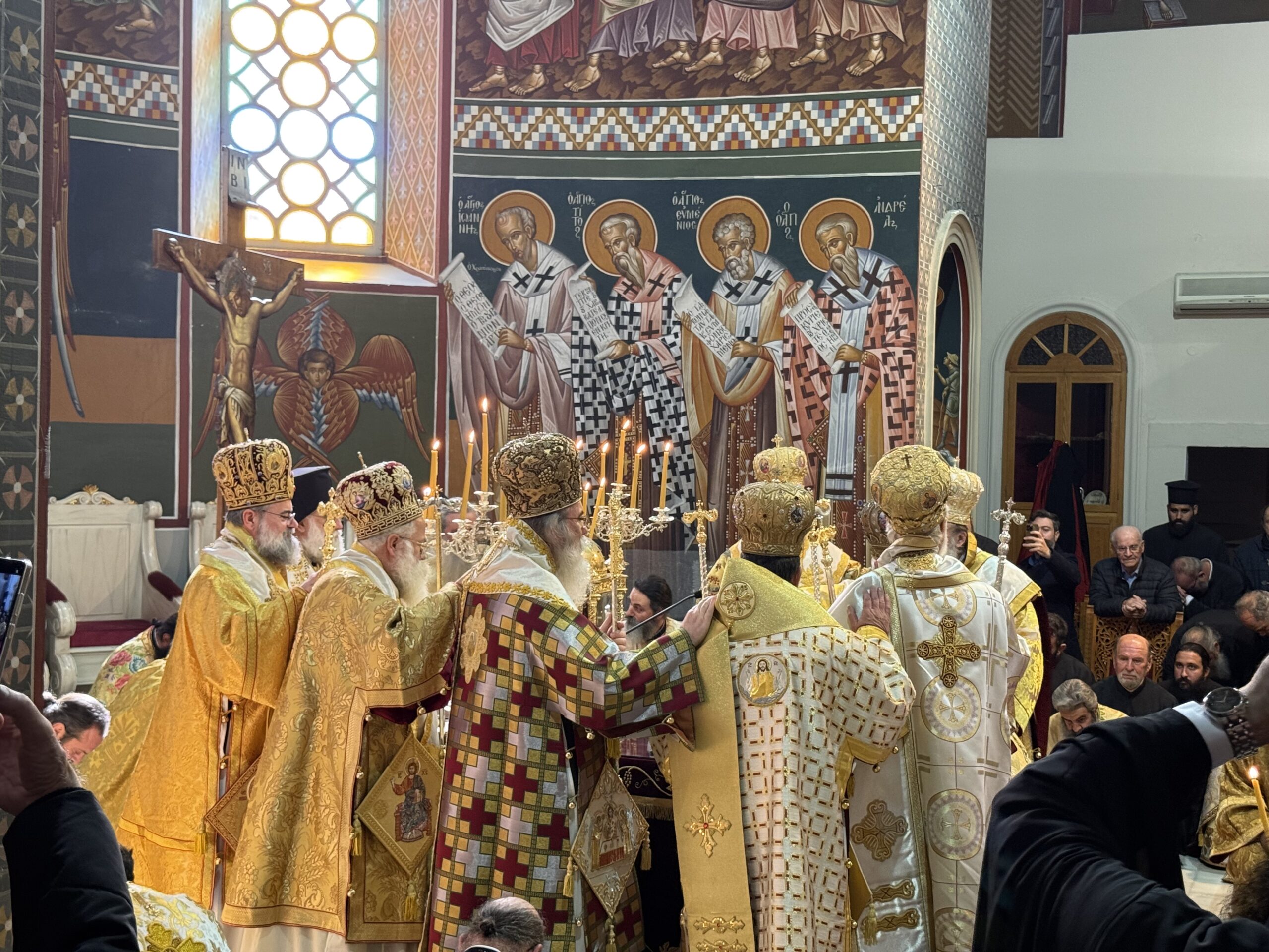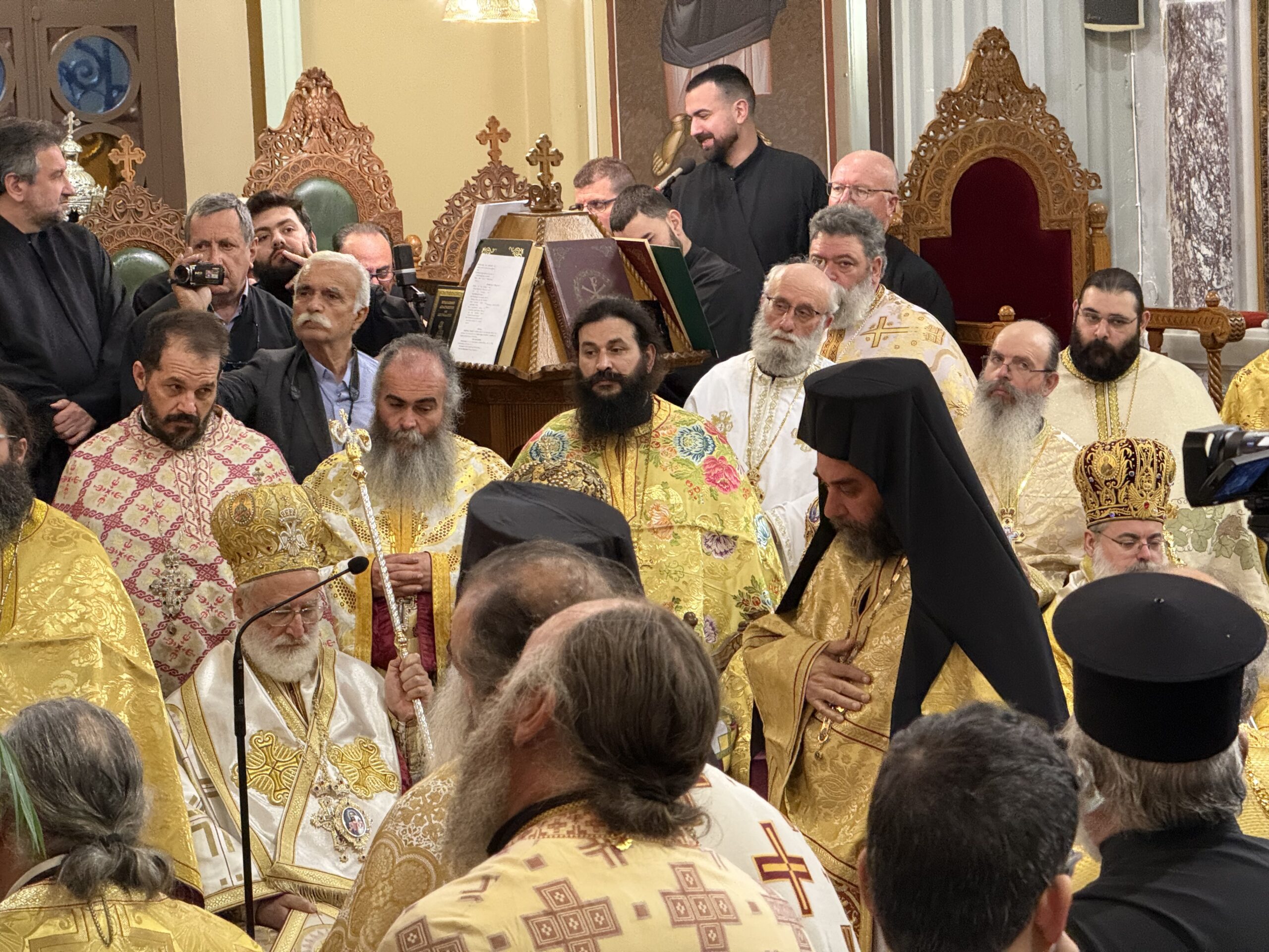 Στον Μητροπολιτικό Ναό του Αγίου Μηνά βρίσκονται – μεταξύ άλλων – η μητέρα του νέου Μητροπολίτη, Κατερίνα και τα αδέρφια Στέλιος και Δημήτρης.