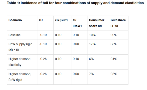 Το βασικό, και ίσως αντιφατικό, συμπέρασμα είναι ότι η παγκόσμια οικονομία επηρεάζεται ελάχιστα από ένα τέτοιο διόδιο, υπό την προϋπόθεση ότι αποκαθίσταται η ροή πετρελαίου. Το μεγαλύτερο βάρος δεν θα το επωμιστούν οι καταναλωτές διεθνώς, αλλά κυρίως οι χώρες του Κόλπου που εξάγουν πετρέλαιο μέσω του στενού. Ακόμη κι έτσι, όμως, οι χώρες αυτές θα βρίσκονται σε καλύτερη θέση σε σχέση με το σημερινό σενάριο σύγκρουσης, όπου οι εξαγωγές τους έχουν ουσιαστικά παγώσει.