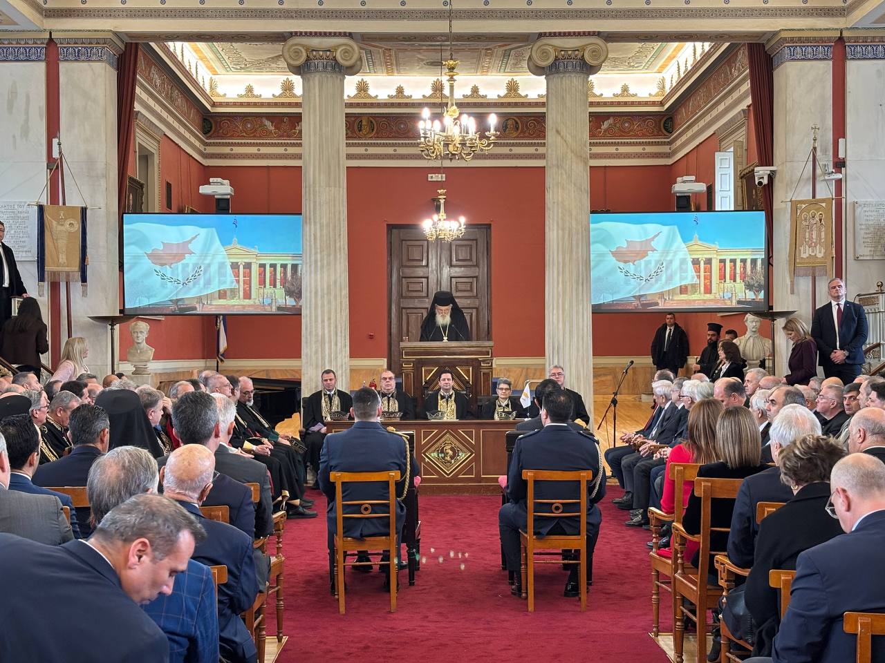 Η εκδήλωση ξεκίνησε με την υποδοχή των επίσημων προσκεκλημένων από τον Πρύτανη, καθηγητή Γεράσιμο Σιάσο, και ακολούθησαν χαιρετισμοί από τον Πρόεδρο της Ελληνικής Δημοκρατίας, κύριο Κωνσταντίνο Αν. Τασούλα, τον Πρόεδρο της Κυπριακής Δημοκρατίας, κύριο Νίκο Χριστοδουλίδη, τον Αρχιεπίσκοπο Αθηνών και πάσης Ελλάδος, κύριο Ιερώνυμο Β’, τον Αρχιεπίσκοπο Νέας Ιουστινιανής και πάσης Κύπρου, κύριο Γεώργιο και την εκπρόσωπο του Πρωθυπουργού, Υπουργό Παιδείας, Θρησκευμάτων και Αθλητισμού κυρία Σοφία Ζαχαράκη.