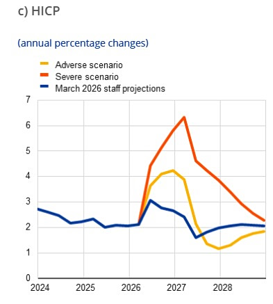 Σύμφωνα με το πιο ακραίο σενάριο ο πληθωρισμός κορυφώνεται στο 6,3% το πρώτο τρίμηνο του 2027 ενώ η ευρωζώνη οδηγείται σε ύφεση, καταγράφοντας συρρίκνωση στο δεύτερο και τρίτο τρίμηνο του 2026.