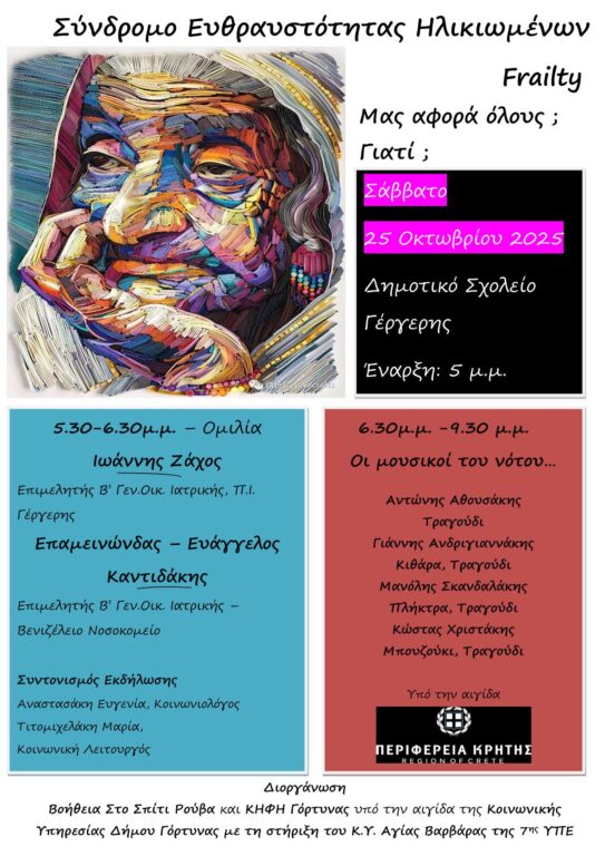Με την αύξηση του προσδόκιμου ζωής και του πληθυσμού της τρίτης και τέταρτης ηλικίας, το σύνδρομο ευθραυστότητας αποτελεί μια νέα πρόκληση για τους επαγγελματίες υγείας. Σας προσκαλούμε να μάθετε τους παράγοντες κινδύνου αλλά και πώς αντιμετωπίζεται το Σάββατο 25 Οκτωβρίου 2025 στις 17:00 στην αίθουσα εκδηλώσεων του Δημοτικού Σχολείου Γέργερης.