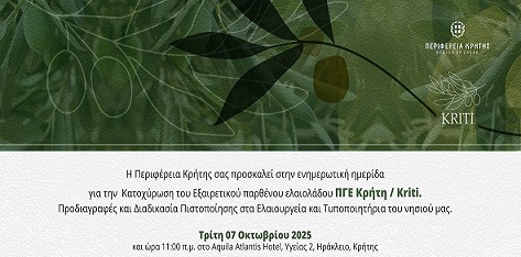 Η πρόσφατη, επίσημη αναγνώριση του «Εξαιρετικού Παρθένου Ελαιολάδου Κρήτη / Kriti» ως προϊόντος Προστατευόμενης Γεωγραφικής Ένδειξης (ΠΓΕ) από την Ευρωπαϊκή Ένωση, αποτελεί την επιτυχή κατάληξη πολυετών και συντονισμένων προσπαθειών της Περιφέρειας Κρήτης και των φορέων του νησιού, για το πολυτιμότερο αγροτικό προϊόν του τόπου. Στο πλαίσιο αυτής της καθοριστικής εξέλιξης, και με στόχο την άμεση και πλήρη ενημέρωση όλων των παραγωγικών φορέων, η Περιφέρεια Κρήτης διοργανώνει εξειδικευμένη ενημερωτική ημερίδα, αύριο Τρίτη 7 Οκτωβρίου 2025 στις 11:00 π.μ. Στο ξενοδοχείο Aquila Atlantis στο Ηράκλειο