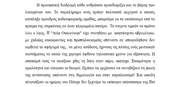 Το παραλήρημα ενός πρώην πολιτικού αρχηγού ο οποίος κατέληξε πρόεδρος ποδοσφαιρικής ομάδας, μπορούμε να το ακούσουμε υπό το πρίσμα της συμπόνιας σε έναν πληγωμένο πατέρα. Τα στερνά τιμούν τα πρώτα λέει ο λαός.