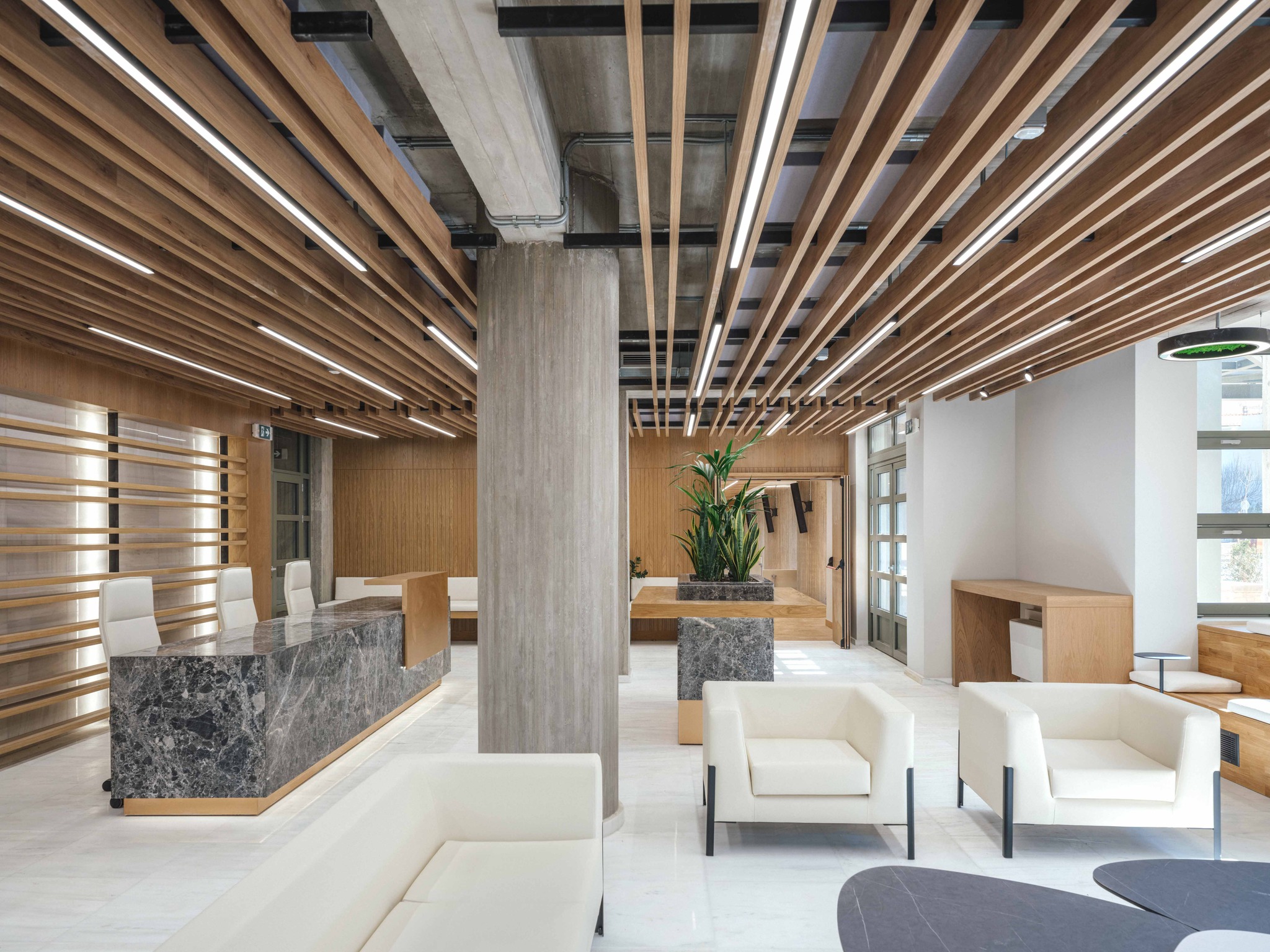 Το ισόγειο λειτουργεί ως δημόσια «πρόσοψη» του κτιρίου, φιλοξενώντας υποδοχή, χώρους αναμονής και εγκαταστάσεις οργανωμένες γύρω από ζώνες συνεργασίας και συνεδριάσεων.