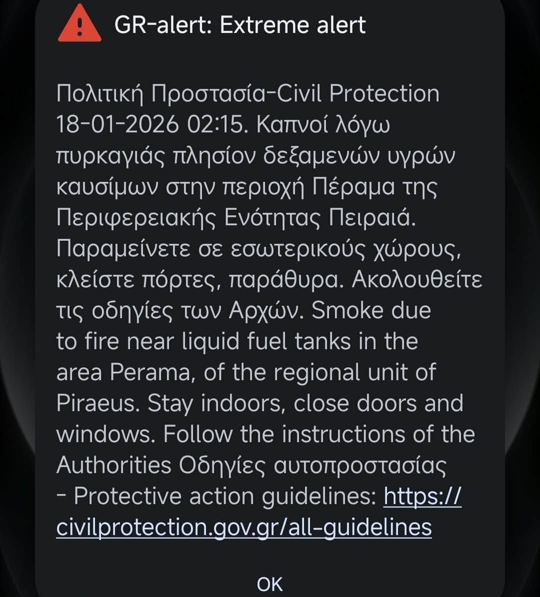 Στις 02:15, απεστάλη σχετικό μήνυμα από τ0 112 της Πολιτικής Προστασίας: