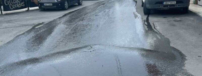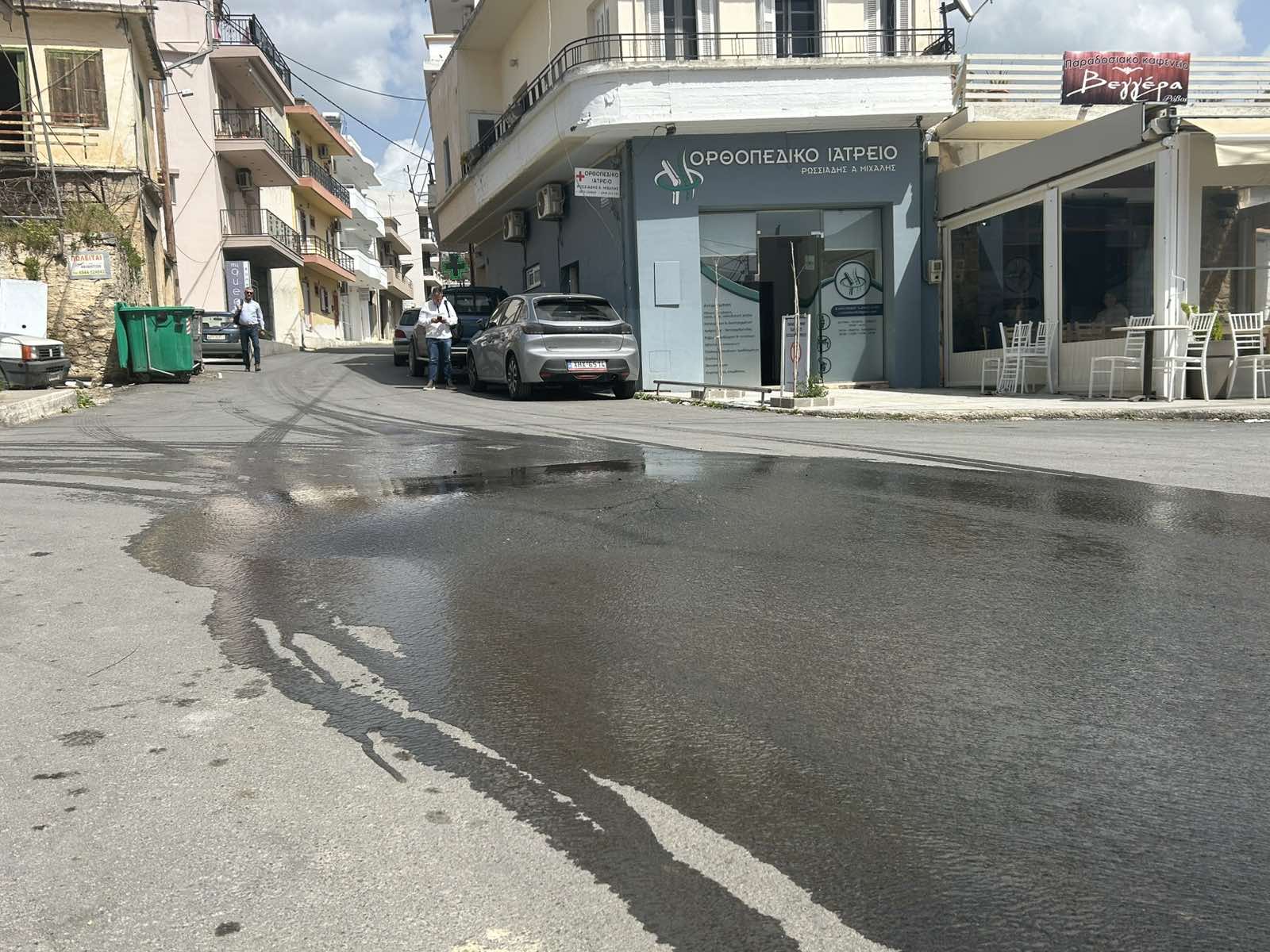 Το δρόμο να είναι φουσκωμένος αντικρίσαν οι άνθρωποι της γειτονιάς το πρωί που πήγαν στις δουλειές τους στην οδό Κόρακα στις Μοίρες μπροστά από την πλατεία το Αγίου Γεωργίου.