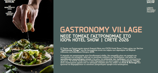 Το Gastronomy Village συμμετέχει για πρώτη φορά στο 100% Hotel Show / Crete 2026, τη premium έκθεση για ξενοδόχους και ιδιοκτήτες villas στην Κρήτη, παρουσιάζοντας τον νέο Τομέα Γαστρονομίας, σε συνεργασία με την Ολυμπιακή Ομάδα Γαστρονομίας.