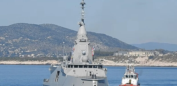 Στο λιμάνι του Πειραιά έκανε σήμερα, Παρασκευή 24 Απριλίου, την παρθενική της εντυπωσιακή εμφάνιση η υπερσύγχρονη φρεγάτα τύπου Belharra, «Κίμων».