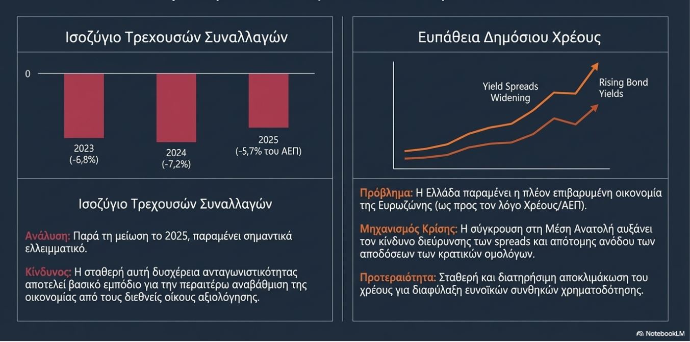 Η δυσχέρεια στη διεθνή ανταγωνιστικότητα έναντι των εταίρων μας εξακολουθεί να απεικονίζεται στο Ισοζύγιο Τρεχουσών Συναλλαγών το οποίο, παρά τη μείωση του ελλείμματός του, το 2025, στο 5,7% του ΑΕΠ (έναντι ελλείμματος 7,2% το 2024 και 6,8% το 2023), παραμένει σημαντικά ελλειμματικό.