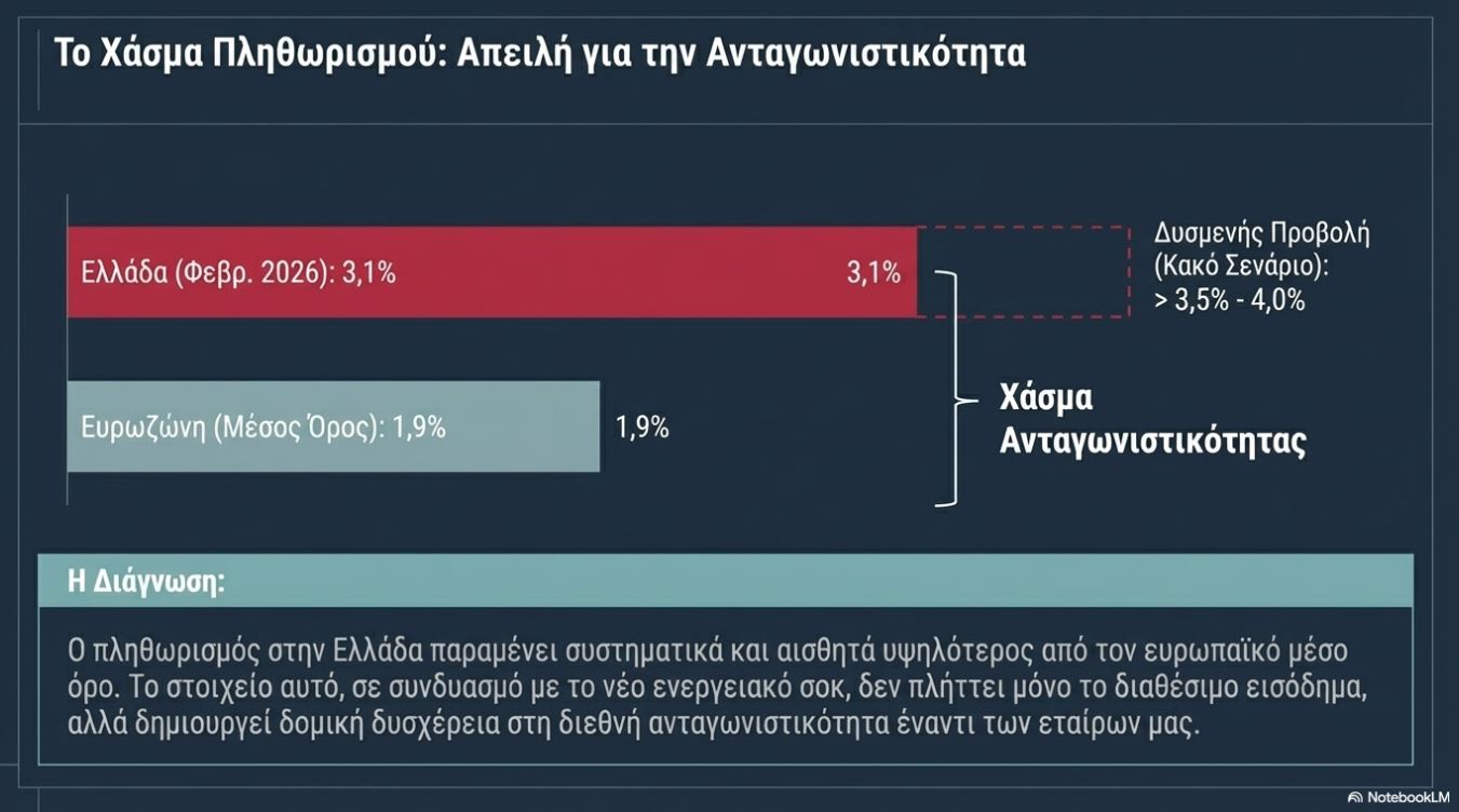 Σύμφωνα με τα στοιχεία της ΕΛΣΤΑΤ ο πληθωρισμός ανήλθε τον Φεβρουάριο του 2026 στο 3,1% και εξακολουθεί να βρίσκεται αρκετά πάνω από τον μέσο πληθωρισμό στην Ευρωζώνη (1,9%), γεγονός που δυσχεραίνει τη διεθνή ανταγωνιστικότητα έναντι των εταίρων μας.