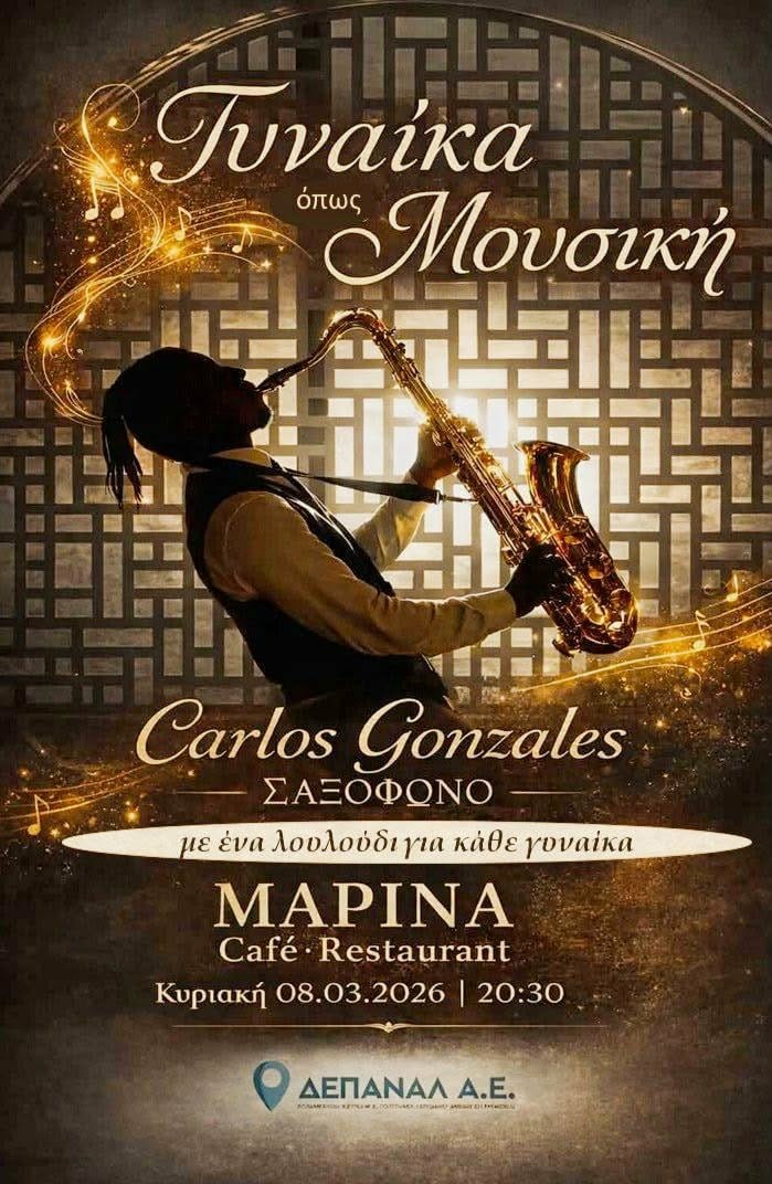 Μια βραδιά γεμάτη μελωδίες σαξοφώνουμε τον υπέροχο CarlosGonzalez, θα πραγματοποιηθεί την Κυριακή 8 Μαρτίου, στις 20:30 στο MarinaCaféRestaurant.