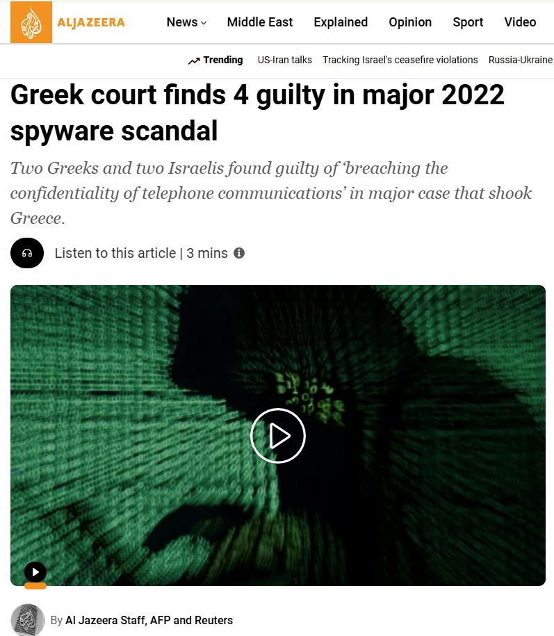 Σημειώνει επίσης ότι ένα στα τρία από αυτά τα πρόσωπα βρισκόταν επίσης υπό νόμιμη παρακολούθηση από τις ελληνικές υπηρεσίες πληροφοριών (ΕΥΠ). Και πως ο πρωθυπουργός της Ελλάδας, Κυριάκος Μητσοτάκης, ο οποίος είχε θέσει την ΕΥΠ απευθείας υπό την εποπτεία του, το χαρακτήρισε σκάνδαλο. Ωστόσο, κανένας κυβερνητικός αξιωματούχος δεν έχει κατηγορηθεί στο δικαστήριο και η ελληνική κυβέρνηση κατηγορείται ότι προσπαθεί να συγκαλύψει την αλήθεια.