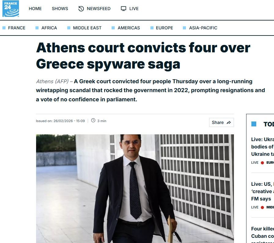 Η ιστορική απόφαση του Μονομελούς Πλημμελειοδικείου Αθηνών για το σκάνδαλο των υποκλοπών έχει κάνει τον γύρο του κόσμου. Τα διεθνή ΜΜΕ αναφέρονται εκτενώς στην υπόθεση που έχει συνταράξει την Ελλάδα από το 2022, καθώς παρακολουθούνταν μέσω Predator 87 άτομα, πολιτικά πρόσωπα, δημοσιογράφοι, επιχειρηματίες κ.ά.