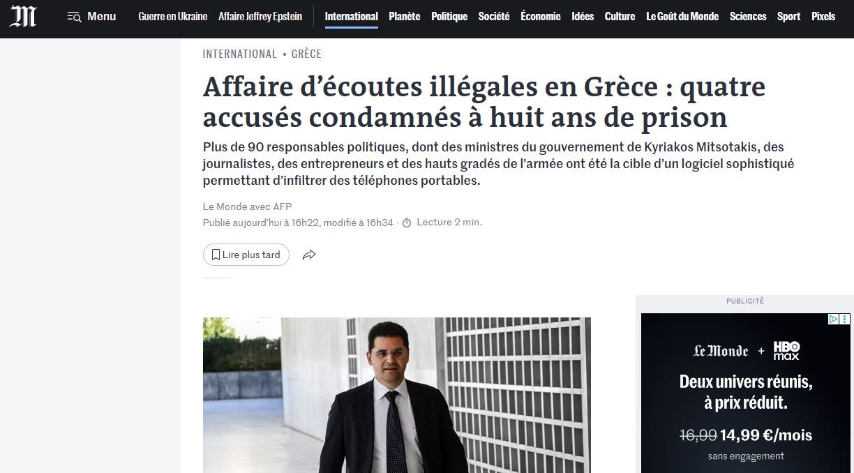 Όπως και τα άλλα διεθνή ΜΜΕ, η Monde θυμίζει ότι το σκάνδαλο υποκλοπών ξέσπασε στις αρχές του 2022 όταν ο Θανάσης Κουκάκης ανακάλυψε ότι είχε παρακολουθηθεί από τις υπηρεσίες πληροφοριών (ΕΥΠ). Αλλά και ότι το τηλέφωνό του είχε μολυνθεί με το Predator. Επίσης, ότι μετατράπηκε σε πολιτικό σκάνδαλο όταν, τον Ιούλιο του 2022, ο Νίκος Ανδρουλάκης ανακοίνωσε ότι το κινητό του τηλέφωνο είχε γίνει στόχος απόπειρας μόλυνσης από αυτό το λογισμικό.