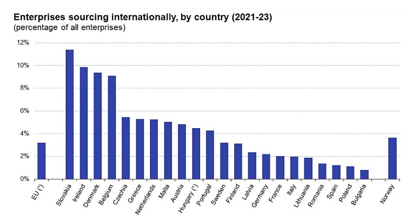 «Το υψηλότερο ποσοστό προμήθειας από το εξωτερικό παρατηρείται σε μικρές, ανοιχτές οικονομίες με υψηλό κόστος εργασίας», αναφέρει η Eurostat.
