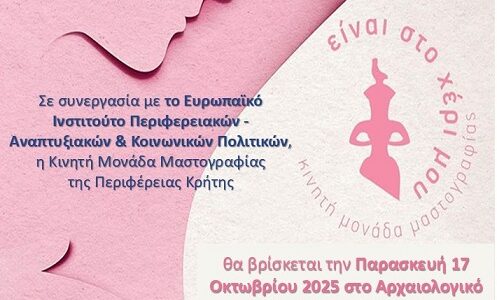 Η Κινητή Μονάδα Μαστογραφίας της Περιφέρειας Κρήτης συνεχίζει την διαδρομή της προσφοράς, με στόχο την πρόληψη του καρκίνου του μαστού και σταθμεύει την Παρασκευή 17 Οκτωβρίου 2025 (από τις 09:00) στο Αρχαιολογικό Μουσείο Μεσαράς. Η δράση, που διοργανώνεται από την Περιφέρεια Κρήτης, σε συνεργασία με το Ευρωπαϊκό Ινστιτούτο Περιφερειακών – Αναπτυξιακών & Κοινωνικών Πολιτικών, στο πλαίσιο του Gortys Forum 2025, θα δώσει την ευκαιρία σε γυναίκες ηλικίας άνω των 40 ετών να υποβληθούν, δωρεάν, σε μαστογραφικό έλεγχο. Προτεραιότητα θα δοθεί στις γυναίκες που, έως τώρα, δεν έχουν υποβληθεί ποτέ σε μαστογραφικό έλεγχο και σε ανασφάλιστες γυναίκες. Για περισσότερες πληροφορίες και ραντεβού, οι ενδιαφερόμενες παρακαλούνται να απευθύνονται στα τηλέφωνα 2892340340 και 2892340350.