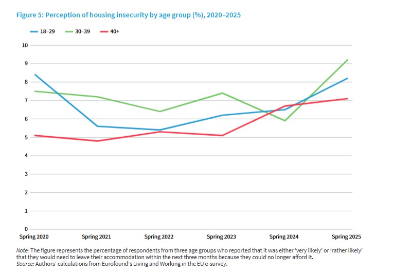 Η έκθεση του Eurofound εξετάζει το θέμα εστιάζοντας στις νέες γενιές, οι οποίες φαίνεται να βιώνουν την κρίση στέγασης ακόμα πιο έντονα σε σύγκριση με τις μεγαλύτερες ηλικιακές ομάδες. Ωστόσο, σε όλες τις ηλικιακές ομάδες του συνολικού δείγματος και σε όλα τα κύματα της έρευνας, η στεγαστική ανασφάλεια εμφανίζεται συχνότερα στην Κύπρο (12,7%), στην Ελλάδα (10,9%) και στην Πορτογαλία (9,1%).