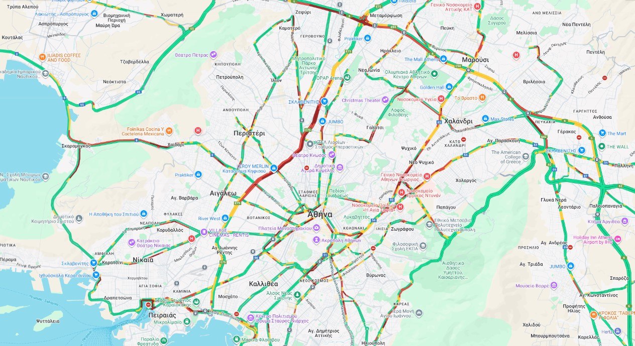 Στην Κηφισίας, η κυκλοφορία διεξάγεται με δυσκολία, κυρίως στο ύψος του Ψυχικού, ενώ αυξημένος είναι ο φόρτος στη Μεσογείων (ιδίως στη συμβολή με την Κατεχάκη) και στην περιοχή του Καρέα. Προβλήματα στην κυκλοφορία παρουσιάζουν επίσης δρόμοι του Πειραιά και του Καλαμακίου.