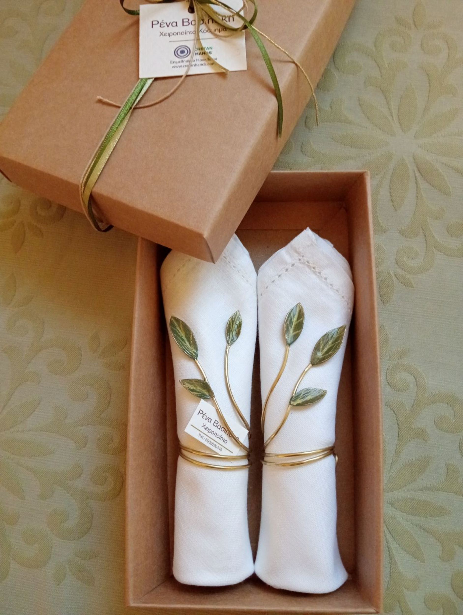 · 1ο Βραβείο: Σετ πετσετών φαγητού με χειροποίητα δαχτυλίδια από μέταλλο ορείχαλκου, εμπνευσμένα από την ελιά – Ειρήνη Βασιλάκη.
