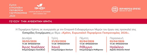 Στη διοργάνωση σειράς εσπερίδων ενημέρωσης, προχωρά η Περιφέρεια Κρήτης, στο πλαίσιο της διάκρισής της ως «Ευρωπαϊκή Περιφέρεια Γαστρονομίας 2026». Οι εσπερίδες έχουν στόχο την ανάδειξη της γαστρονομικής ταυτότητας του νησιού και τη διασύνδεση του πρωτογενούς τομέα με τον τουρισμό.