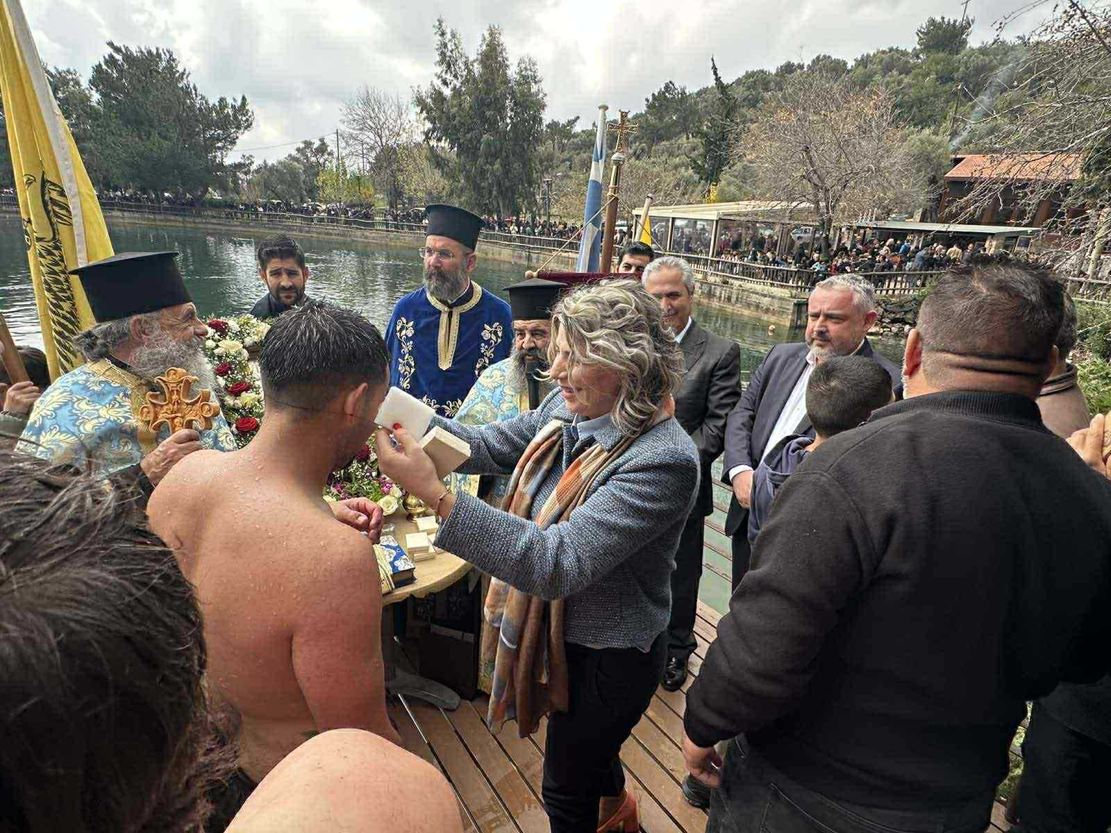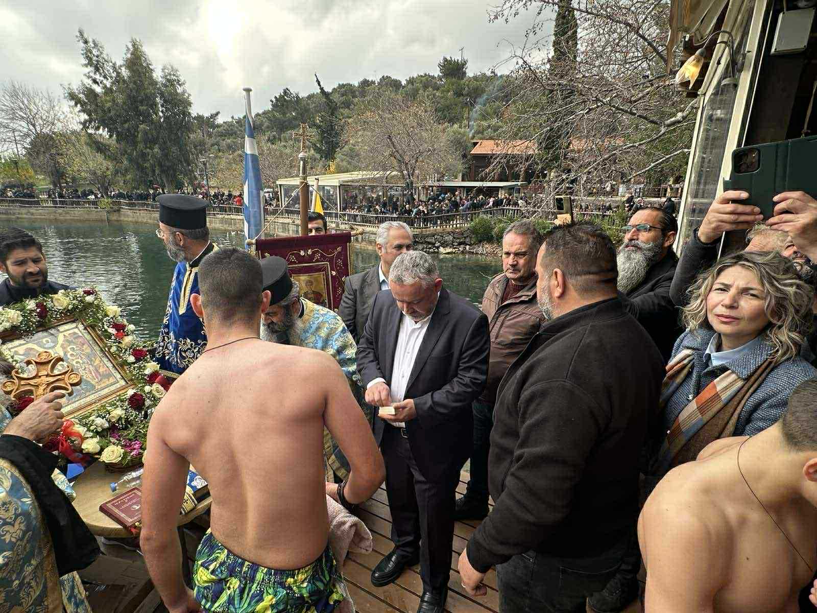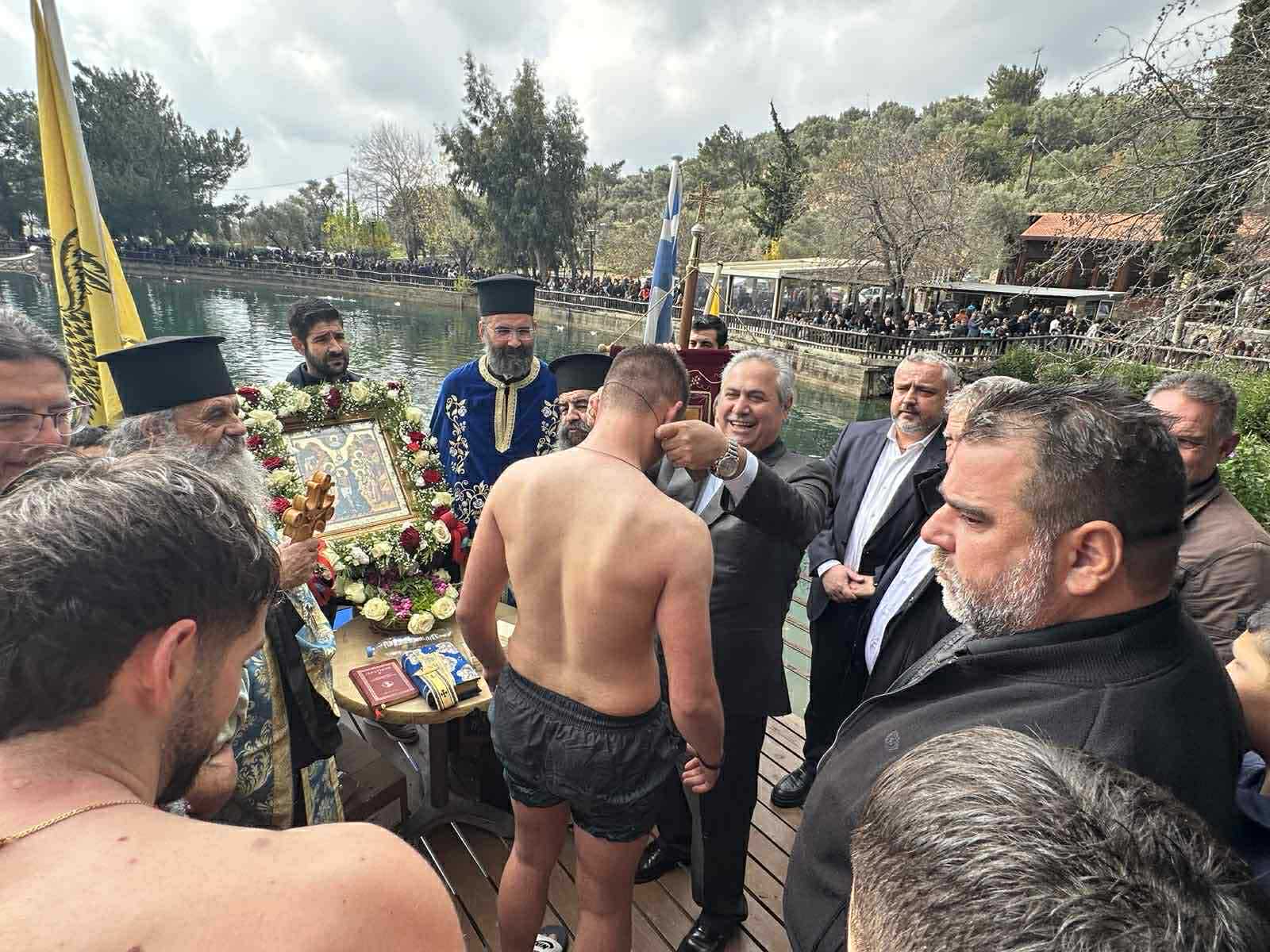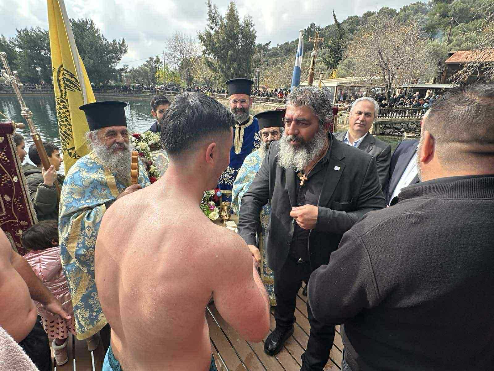 Μετά την ολοκλήρωση της Λειτουργίας ιερείς και πιστοί κατευθύνθηκαν προς την Λίμνη όπου παραδοσιακά πραγματοποιείται η ρίψη του Σταυρού για τα Θεοφάνια.