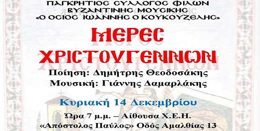 Αυτή την πανδαισία των συναισθημάτων και της συγκίνησης την απολαύσαμε την Κυριακή 14 Δεκεμβρίου το βράδυ, στην αίθουσα του Αγ. Παύλου στο Ηράκλειο. Ο Παγκρήτιος Σύλλογος φίλων Βυζαντινής μουσικής « Ο όσιος Ιωάννης ο Κουκουζέλης» μέσα από την ποίηση του χαρισματικού Δημήτρη Θεοδοσάκη και την μουσική επιμέλεια – σύνθεση του Άρχοντα της Βυζαντινής Μουσικής Ιωάννη Δαμαρλάκη με τους εξαίρετους μουσικούς Βασιλάκη Ελένη, Σγουρίδη Μάνο, Σταυρίδη Αργυρώ, Σταυρίδου Ειρήνη, Φρουδάκης Κων/νος, Χαρκούτσης Γιάννης και τη Βυζαντινή Χορωδία Κρήτης υπό την διεύθυνση του Γιάννη Δαμαρλάκη και την αφήγηση της Εύας Καπελλάκη Κοντού.