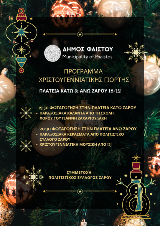 Ο Δήμος Φαιστού ανακοινώνει την τροποποίηση της ημερομηνίας για την εκδήλωση φωταγώγησης του Χριστουγεννιάτικου Δέντρου στη Δημοτική Ενότητα Ζαρού.