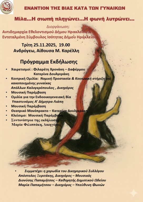 «Μίλα… Η σιωπή πληγώνει, η φωνή λυτρώνει», είναι το θέμα της εκδήλωσης ευαισθητοποίησης εναντίον της βίας κατά των γυναικών που διοργανώνουν η Αντιδημαρχία Εθελοντισμού του Δήμου Ηρακλείου και η Εντεταλμένη Σύμβουλος Ισότητας των Φύλων Κατερίνα Δουλγεράκη, την Τρίτη 25 Νοεμβρίου στις 19:00 το απόγευμα, στην αίθουσα «Μανόλης Καρέλλης» στο δημοτικό κτίριο στην Ανδρόγεω (2ος όροφος).