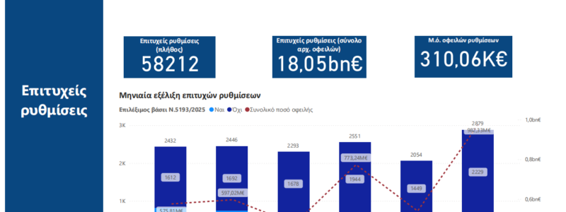 Από την έναρξη λειτουργίας του Μηχανισμού έχουν έως σήμερα ολοκληρωθεί 58.212 ρυθμίσεις, οι οποίες αντιστοιχούν σε αρχικές οφειλές ύψους 18,08 δισ. ευρώ.