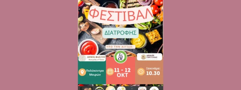 Ο Δήμος Φαιστού ανακοινώνει τη διεξαγωγή του 1ου Πανμεσσαρίτικου Φεστιβάλ Διατροφής, που θα πραγματοποιηθεί το Σάββατο 11 και την Κυριακή 12 Οκτωβρίου 2025 στο Πολύκεντρο Μοιρών, σε συνδιοργάνωση με τον Δήμο Γόρτυνας, το Κέντρο Εκπαίδευσης και Αντιμετώπισης Διατροφικών Διαταραχών (ΚΕΑΔΔ) και το Ινστιτούτο Διατροφικών Μελετών και Ερευνών, υπό την αιγίδα της Ένωσης Διαιτολόγων – Διατροφολόγων Ελλάδος (ΕΔ-ΔΕ).