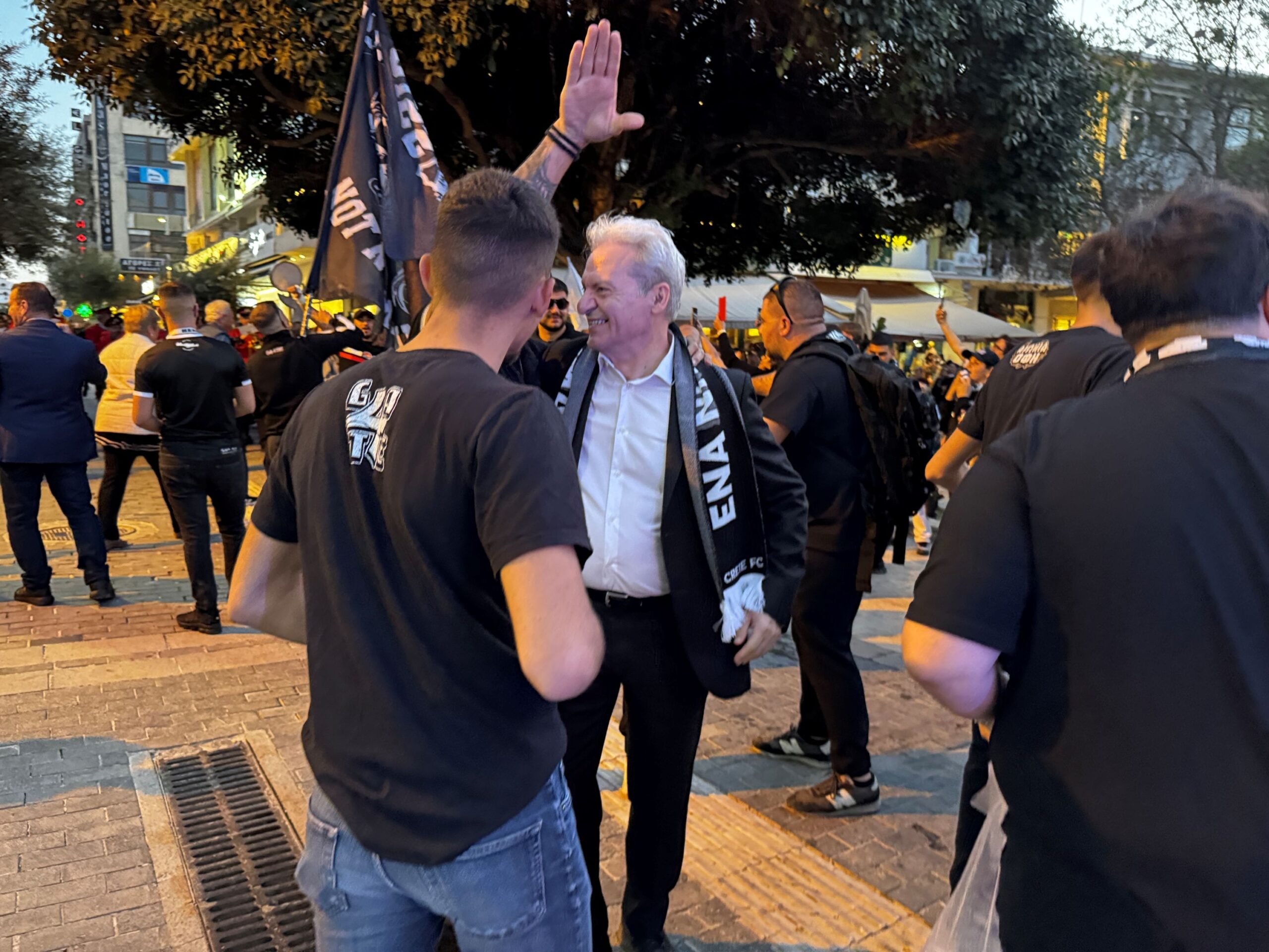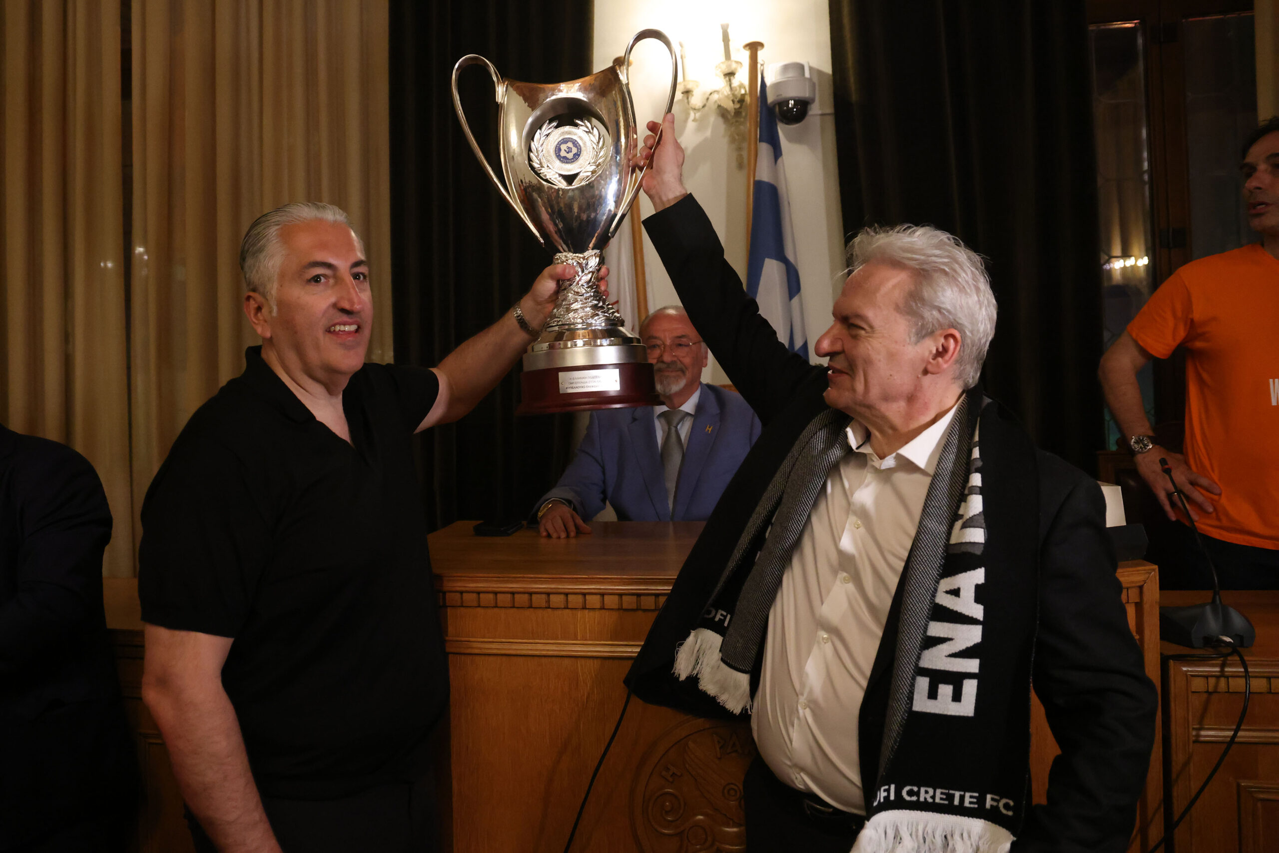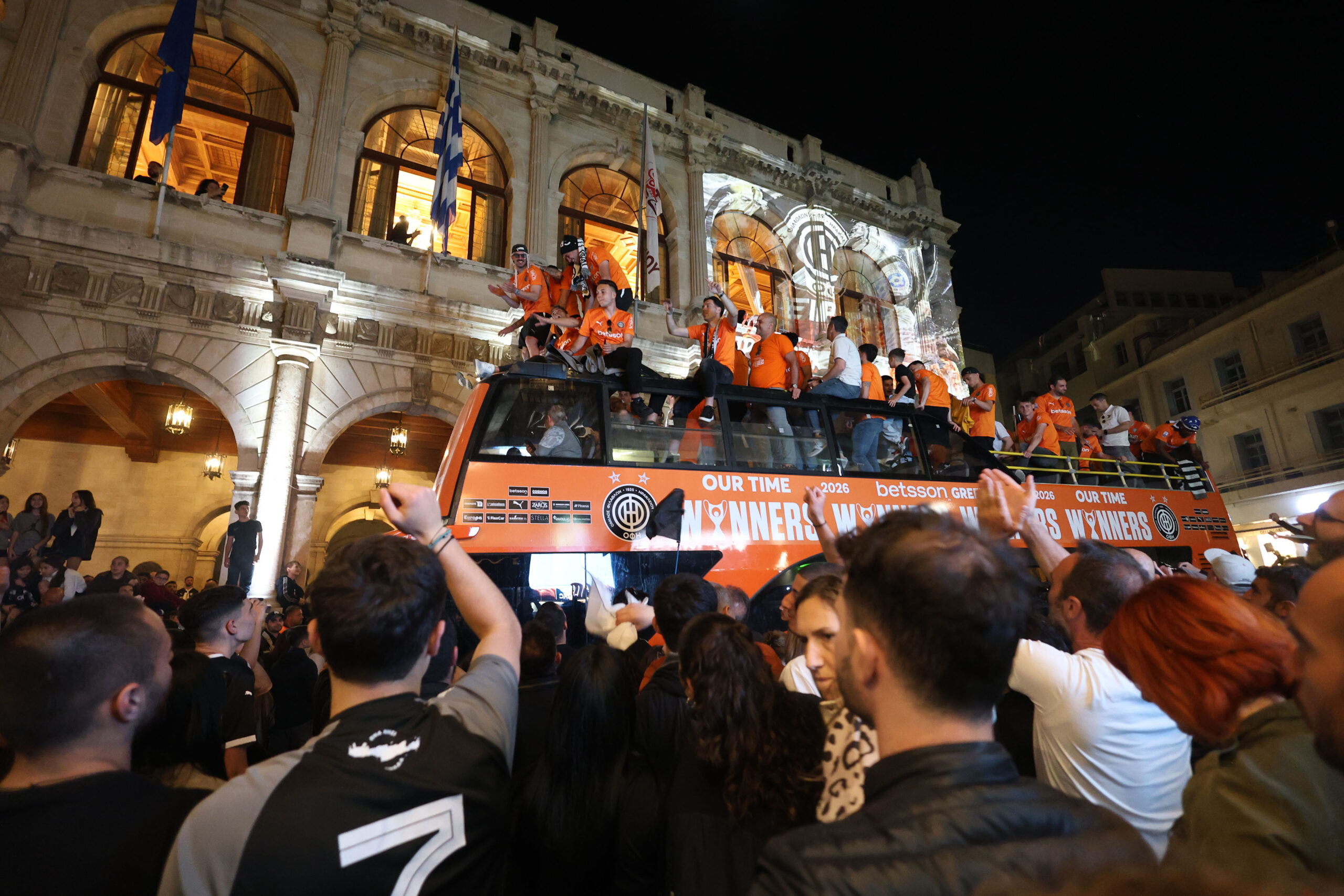 Ξεχωριστή στιγμή η ύψωση του τρόπαιου μέσα στην αίθουσα του Δημοτικού Συμβουλίου «Ελευθέριος Βενιζέλος» από τον Μιχάλη Μπούση και τον Αλέξη Καλοκαιρινό αλλά και οι εικόνες από τα παράθυρα του ιστορικού κτιρίου της Λότζια με το κύπελλο να σκορπά ρίγη συγκίνησης και τους φιλάθλους να αποθεώνουν παίκτες, προπονητή και διοίκηση.