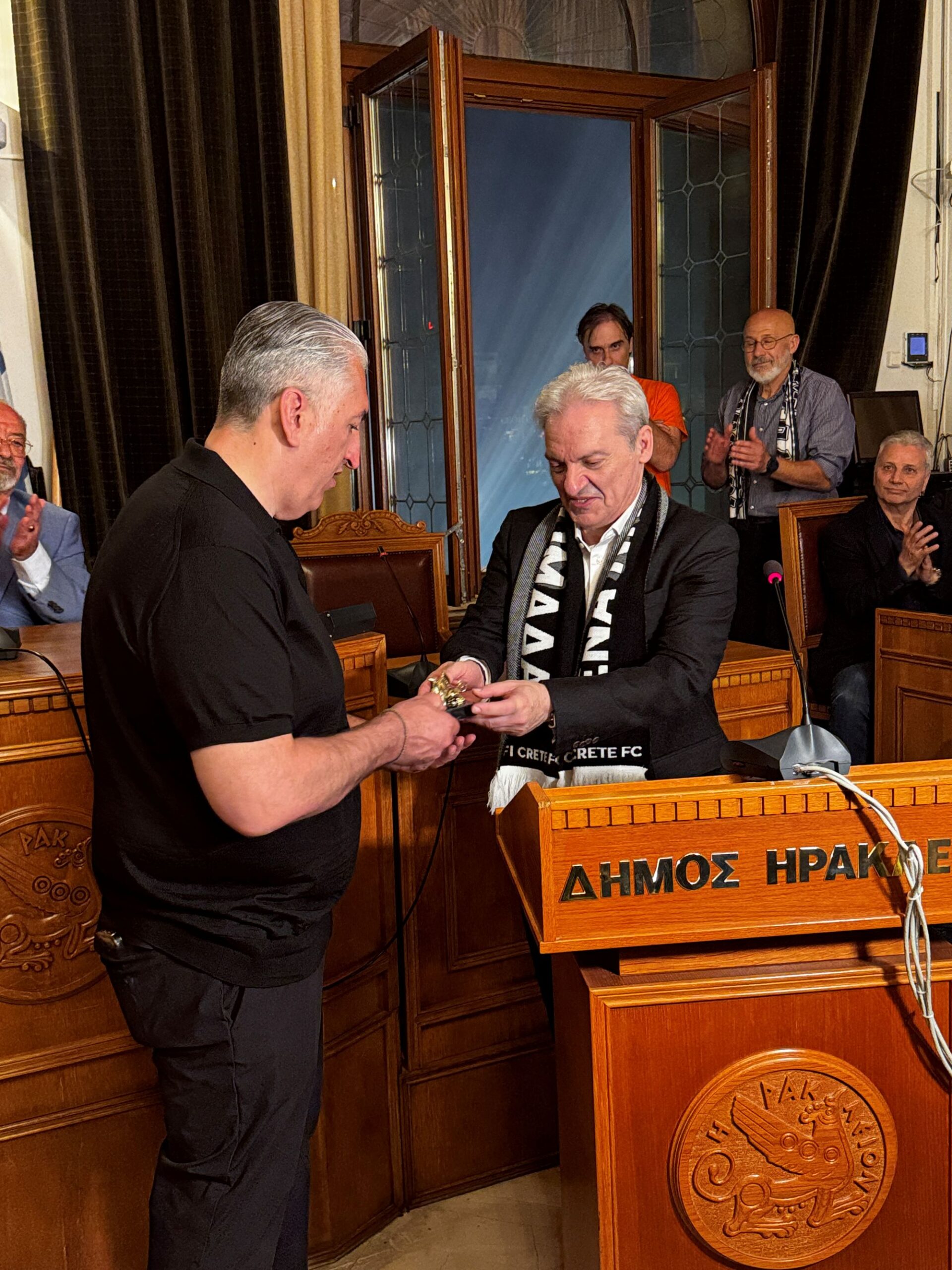 Ο Δήμαρχος Ηρακλείου, μαζί με μέλη της Δημοτικής Αρχής και Δημοτικούς Συμβούλους καλωσόρισε την ομάδα στην είσοδο της Λότζια, ενώ η εορταστική ατμόσφαιρα συνεχίστηκε στην πανηγυρική συνεδρίαση του Δημοτικού Συμβουλίου προς τιμήν του ΟΦΗ, όπου παραβρέθηκαν επίσης η Βουλευτής του ΠΑΣΟΚ Ελένη Βατσινά, ο Δήμαρχος Μαλεβιζίου Μενέλαος Μποκέας, τα μέλη του Δ.Σ. της ΑΑΗ ΑΕ ΟΤΑ και εκπρόσωποι Φορέων.