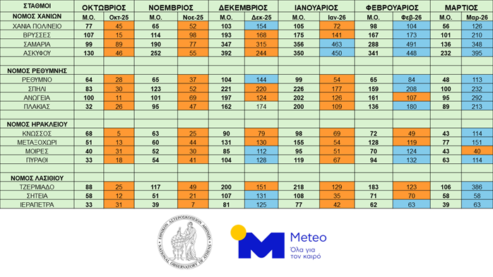 · Τον Μάρτιο του 2026, τα ύψη βροχής ήταν σε όλο το νησί εξαιρετικά υψηλά. Ειδικά στο οροπέδιο Λασιθίου το μηνιαίο ύψος βροχής ήταν σχεδόν τετραπλάσιο του μέσου όρου του μήνα.