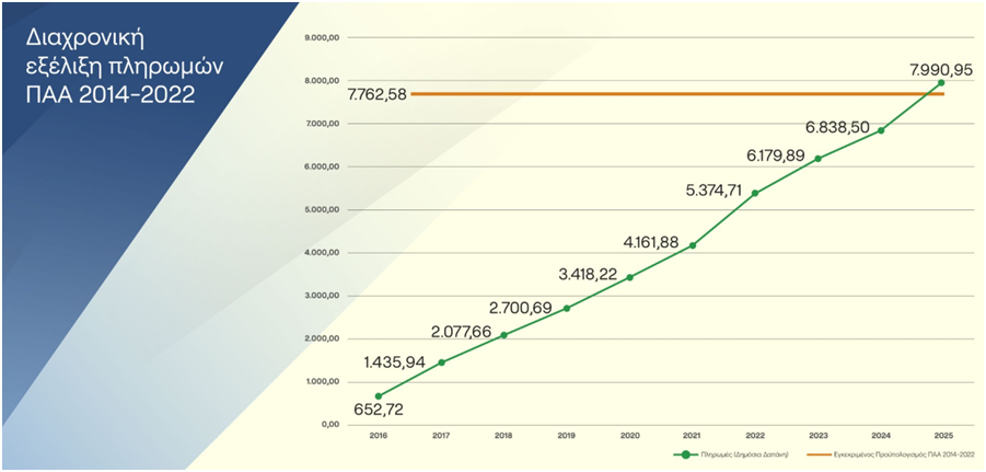 Το σύνολο των πληρωμών και από τα δύο προγράμματα, ΠΑΑ και ΣΣ ΚΑΠ, ανήλθαν εντός του 2025 σε 1.447,64 εκ. €, το οποίο είναι και το μεγαλύτερο ποσό που έχει πληρωθεί σε δράσεις του Πυλώνα ΙΙ της ΚΑΠ εντός του ίδιου έτους εφαρμογής της.