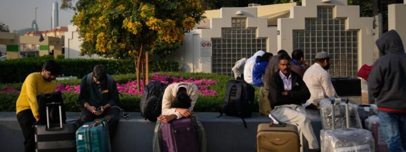 Επιβάτες που έχουν αποκλειστείλ περιμένουν στο πάρκινγκ του αεροδρομίου στο Ντουμπάι. AP Photo/Altaf Qadri