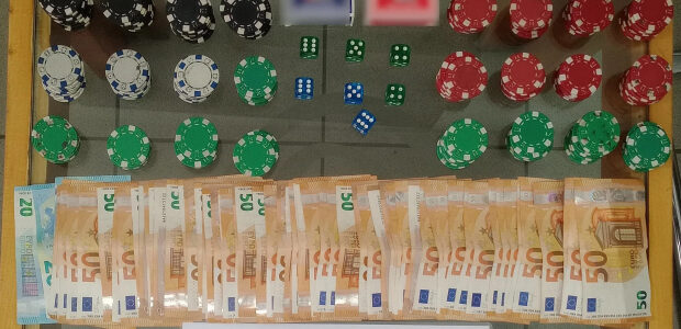 Οι αστυνομικοί κατά την έρευνα τους στο κατάστημα βρήκαν και κατάσχεσαν ως πειστήρια 3.865 ευρώ, 314 μάρκες, 2 τράπουλες και 7 ζάρια.