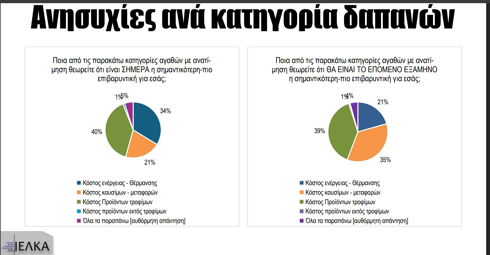 Στην ερώτηση «Ποια από τις παρακάτω κατηγορίες αγαθών θεωρείτε ότι είναι σήμερα η σημαντικότερη-πιο επιβαρυντική για εσάς;», το 40% απαντά ότι είναι το κόστος των τροφίμων. Ακολουθεί το κόστος της ενέργειας και της θέρμανσης, με 34%. Η ανησυχία για το κόστος των καυσίμων έρχεται στην τρίτη θέση, με 21%. Ένα ελάχιστο ποσοστό, μόλις 1% ανησυχεί για το κόστος των καταναλωτικών αγαθών εκτός από τα τρόφιμα. Τέλος, ένα 5% απαντά αυθόρμητα ότι τον ανησυχούν εξίσου όλα τα παραπάνω.