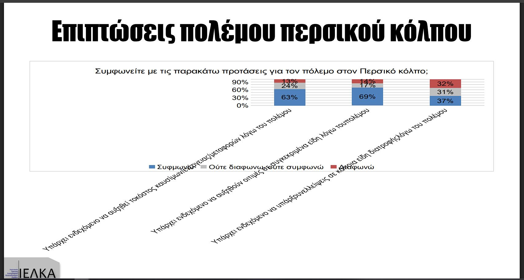 Αντίστοιχα το 63% συμφωνεί ότι ο πόλεμος θα είναι η αιτία για αυξήσεις στο κόστος των καυσίμων, της ενέργειας και των μεταφορών. Ένα αρκετά υψηλό ποσοστό, της τάξης του 37%, φοβάται ότι θα υπάρξουν ελλείψεις σε κάποια είδη διατροφής λόγω του πολέμου, αλλά το 32% διαφωνεί.