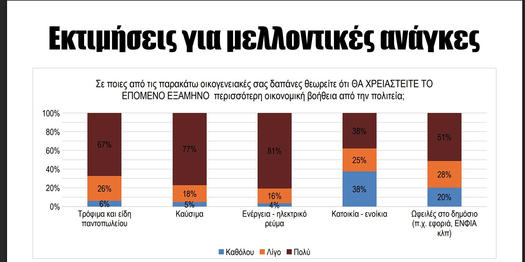 Η συντριπτική πλειονότητα των πολιτών θεωρεί ότι το επόμενο εξάμηνο θα χρειαστούν περισσότερη οικονομική βοήθεια από την πολιτεία, για να καλύψουν βασικές ανάγκες του νοικοκυριού.