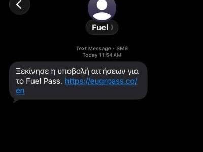 Τις τελευταίες ώρες, πολίτες –μεταξύ αυτών και στο Ηράκλειο– λαμβάνουν παραπλανητικά SMS που εμφανίζονται ως ενημέρωση για το Fuel Pass, υποστηρίζοντας ότι η πλατφόρμα αιτήσεων έχει ήδη ανοίξει. Τα μηνύματα περιλαμβάνουν σύνδεσμο (link), προτρέποντας τους παραλήπτες να τον ακολουθήσουν για να υποβάλουν αίτηση.