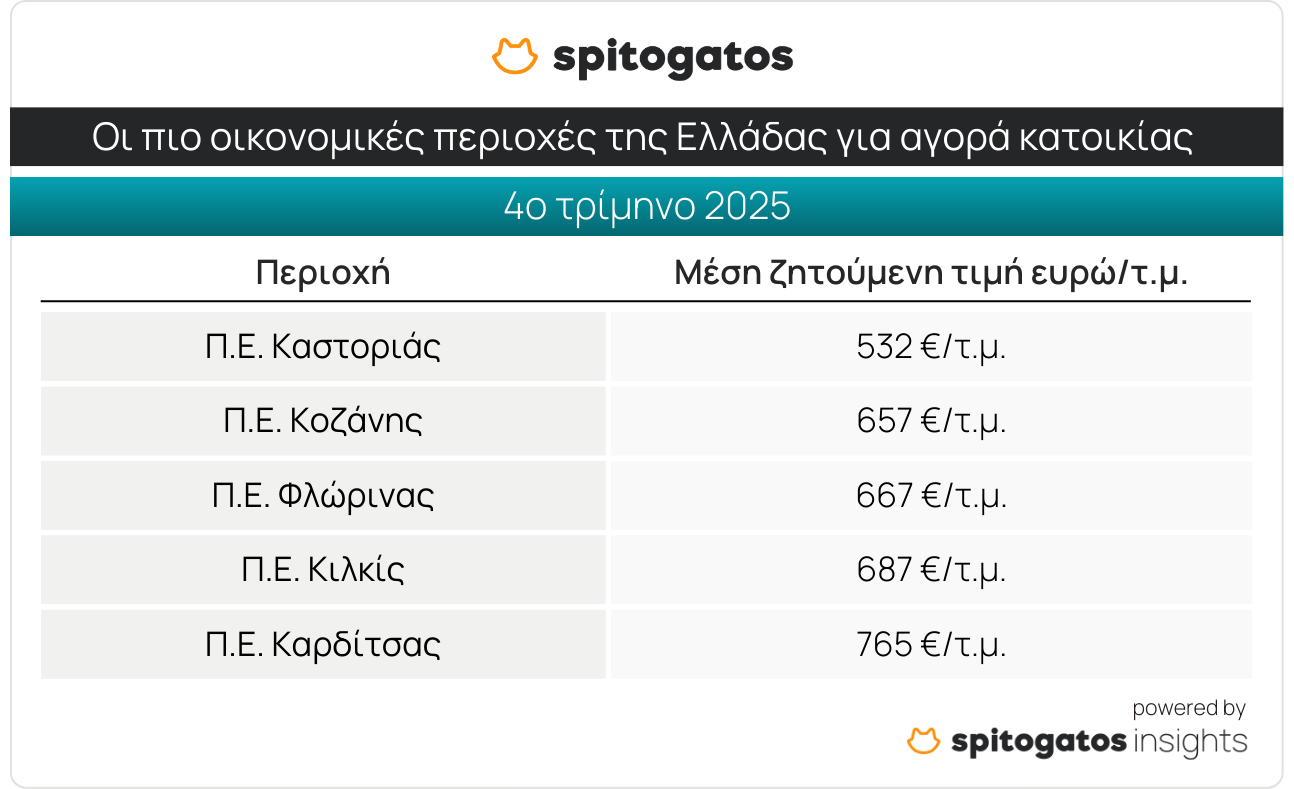 Στον αντίποδα, τα πιο οικονομικά σημεία της χώρας για αγορά κατοικίας είναι η Π.Ε. Καστοριάς με ΜΖΤ πώλησης κατοικίας στα 532 ευρώ/τ.μ., ενώ ακολουθούν οι Π.Ε. Κοζάνης, Φλώρινας, Κιλκίς και Καρδίτσας.