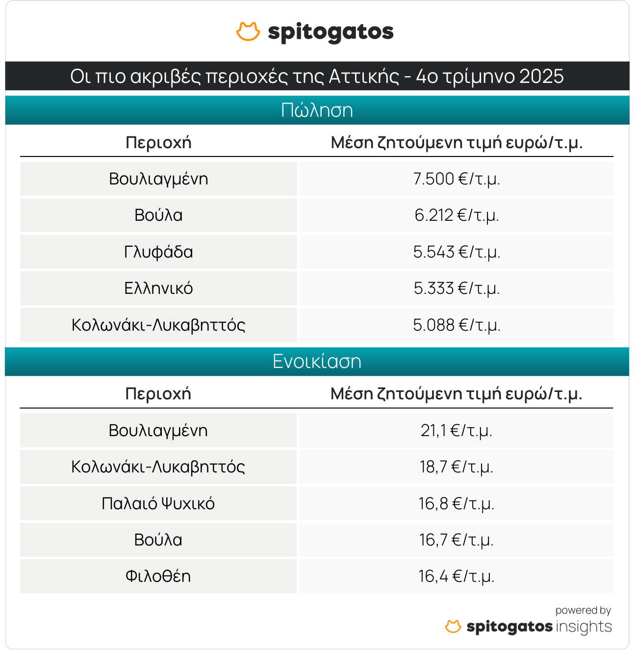 Σε ό,τι αφορά την ενοικίαση κατοικίας, και για το 4ο τρίμηνο του 2025, η Βουλιαγμένη αναδεικνύεται ως η ακριβότερη περιοχή της Αττικής, με ΜΖΤ ενοικίασης στα 21,1 ευρώ/τ.μ., τιμή αυξημένη κατά 5,7% σε σύγκριση με το 4ο τρίμηνο του 2024. Ακολουθούν οι περιοχές Κολωνάκι-Λυκαβηττός, Παλαιό Ψυχικό, Βούλα και Φιλοθέη, με ΜΖΤ που διαμορφώνεται στα 16,4 ευρώ/τ.μ. Στη Φιλοθέη καταγράφεται μείωση -8,0% σε ετήσια βάση, ενώ οι υπόλοιπες περιοχές της πρώτης πεντάδας σημειώνουν ετήσιες αυξήσεις που κυμαίνονται μεταξύ 2,9% και 12,0%.