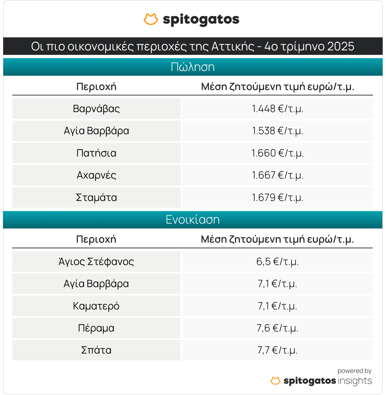 Οι πιο οικονομικές περιοχές για ενοικίαση κατοικίας στην Αττική κατά το 4ο τρίμηνο του 2025 είναι ο Άγιος Στέφανος στα Βόρεια Προάστια της Αθήνας, με ΜΖΤ στα 6,5 ευρώ/τ.μ., η Αγία Βαρβάρα και το Καματερό στα Δυτικά Προάστια, το Πέραμα στα Προάστια του Πειραιά και τα Σπάτα στην Ανατολική Αττική.