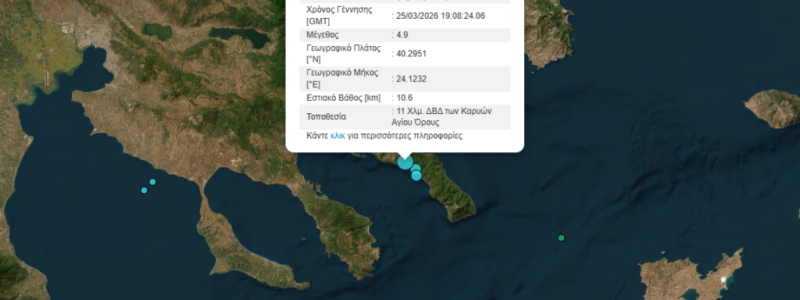 Ισχυρή σεισμική δόνηση 4,9 βαθμών της κλίμακας Ρίχτερ σημειώθηκε στις 21:08 το βράδυ της Τετάρτης 25 Μαρτίου, 8 χιλιόμετρα ΒΔ των Καρυών Αγίου Όρους.