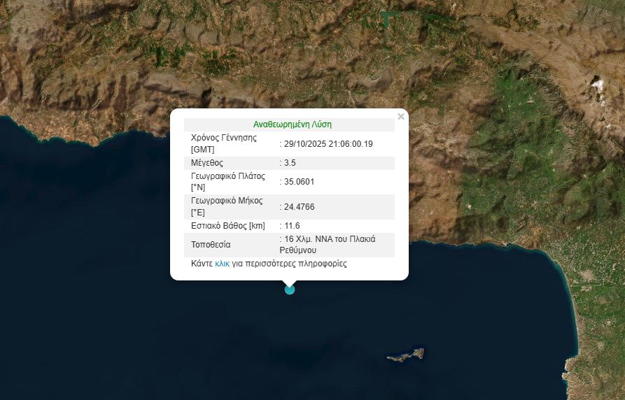 Σεισμός μεγέθους 3,5 βαθμών της κλίμακας Ρίχτερ σημειώθηκε στην Κρήτη το βράδυ της Τετάρτης 29/10.