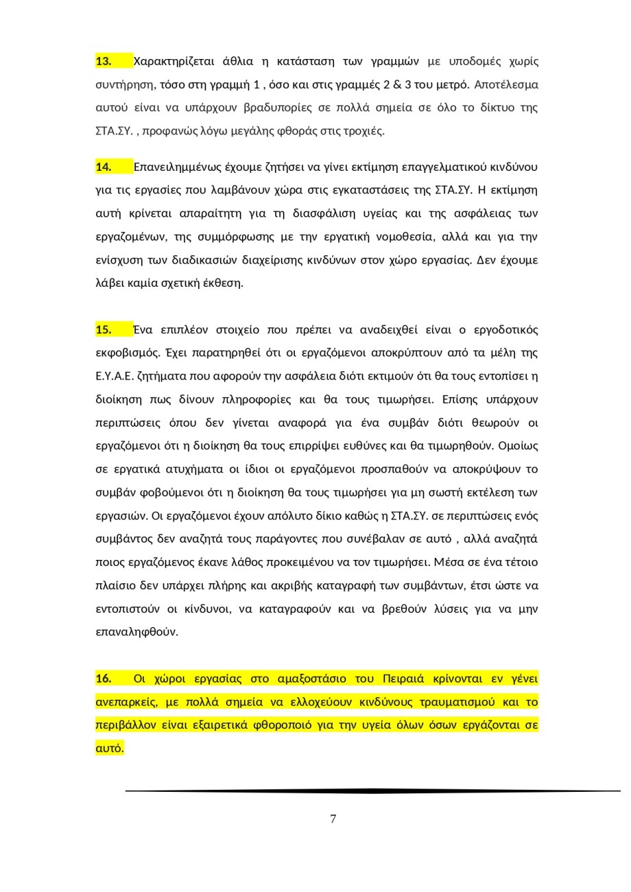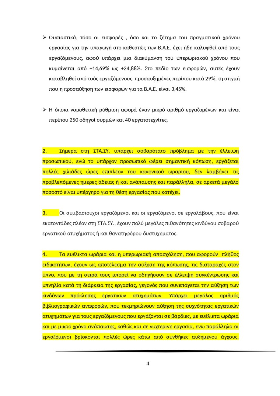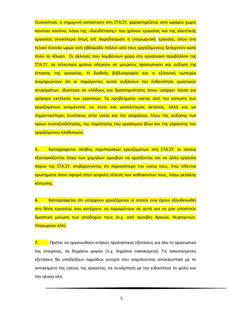 «Τα ευέλικτα ωράρια και η υπερωριακή απασχόληση, που αφορούν πλήθος ειδικοτήτων, έχουν ως αποτέλεσμα την αύξηση της κόπωσης, τις διαταραχές στον ύπνο, που με τη σειρά τους μπορεί να οδηγήσουν σε έλλειψη συγκέντρωσης και υπνηλία κατά τη διάρκεια της εργασίας, γεγονός που συνεπάγεται την αύξηση των κινδύνων πρόκλησης εργατικών ατυχημάτων […] Ουσιαστικά, η σημερινή κατάσταση στη ΣΤΑ.ΣΥ. χαρακτηρίζεται από ωράρια χωρίς κανέναν κανόνα, λόγω της «διευθέτησης» του χρόνου εργασίας και της ελαστικής εργασίας γενικότερα όπως επί παραδείγματι η υπερωριακή εργασία, όπου στο τελικό σύνολο ωρών ανά εβδομάδα πολλοί από τους εργαζόμενους ξεπερνούν κατά πολύ το 40ωρο».